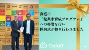 この度、株式会社CotoITは、真庭市が進める市内高校生向け起業家育成プログラムを支援するため、真庭市に対し寄附を実施いたしました。 寄附採納式の様子 左:真庭市長 太田 昇 氏 右:株式会社CotoIT 代表取締役社 […]